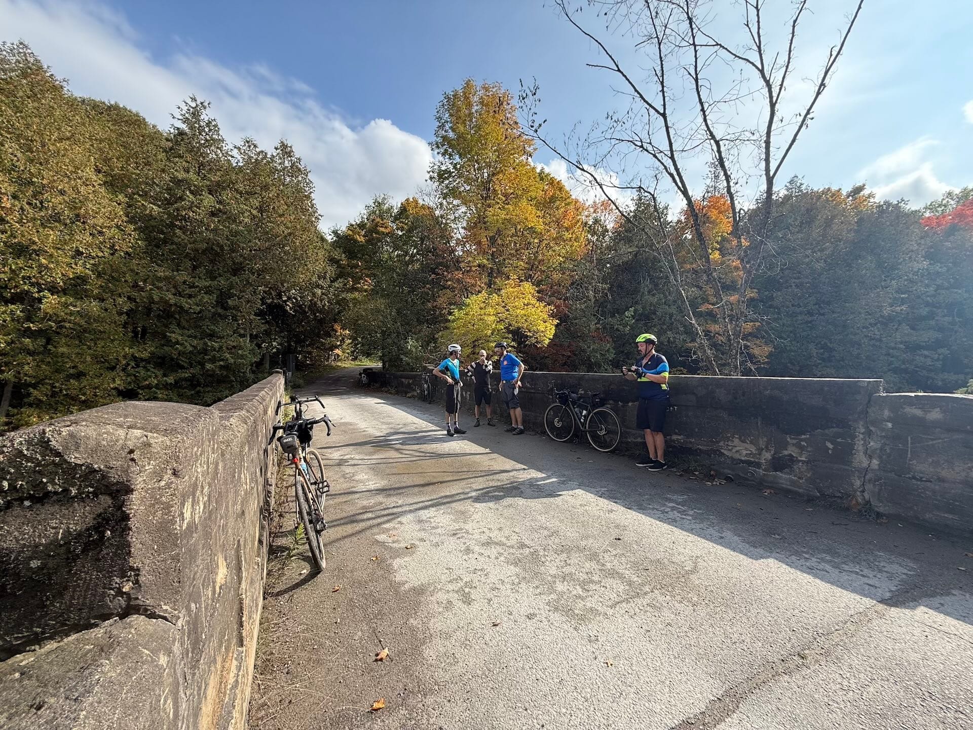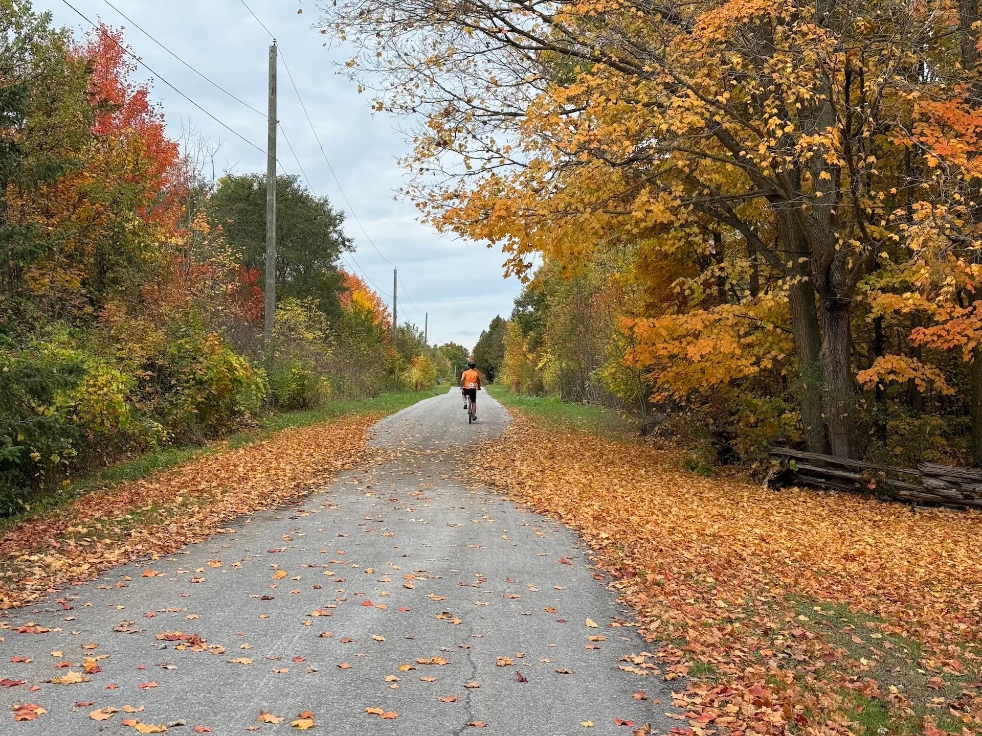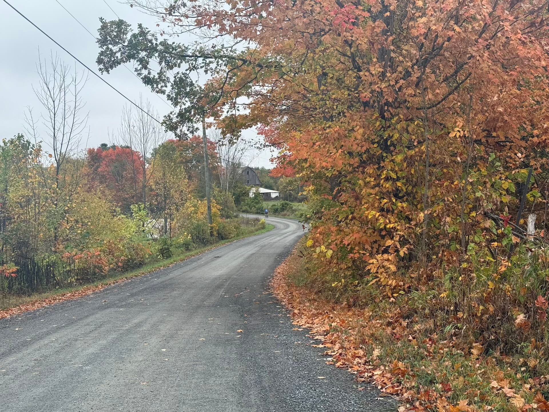 The highlight on Find a Finer Diner was definitely pulling into Stirling and stopping at Farm Girl Café for a piece of peach pie, which we ate near the covered bridge across the street. We checked for trolls—none observed—then continued on our way. Again, the route served up a mix of surfaces, challenges, and an absolute ton of stunning autumn scenes. My pal Garrett, who was wearing an orange jersey, almost disappeared in a sea of orange and yellow maple leaves at one point. The wildlife was entertaining too. My pal Rob and I were riding along at one point and out of nowhere he yelled, “Turkey!,” saving us both from running a-fowl of a wild turkey who was leisurely crossing the road in front of us.